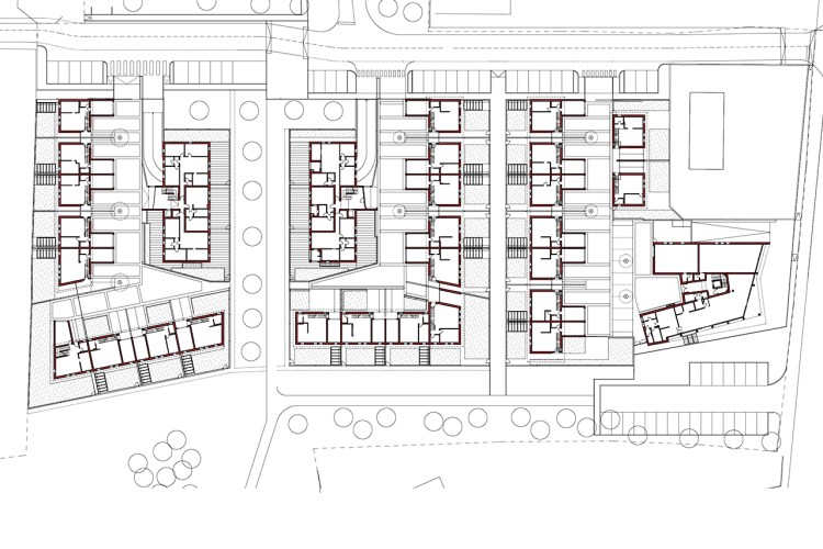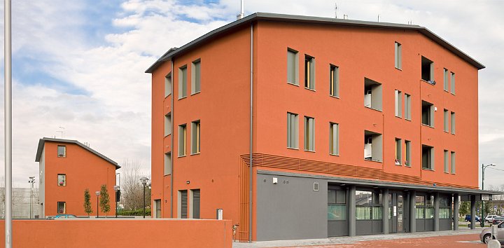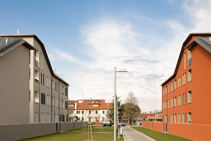 L’intervento per 60 alloggi a Favaro Veneto ricade nell’ambito del Piano per l’Edilizia Economica e Popolare del Comune di Venezia. I tre lotti del progetto risultano costituiti di tre organismi edilizi: due corpi con tipologia a schiera passo di circa 9 metri e una palazzina. Le due tipologie si organizzano all’interno di ciascun lotto intorno a una corte, spazio semipubblico dove sono collocati tutti gli ingressi pedonali e i garage delle case a schiera. A un interno “denso” dove sono collocati gli ingressi, si contrappone un esterno “diradato” dove si affacciano gli alloggi e lo spazio privato si relaziona con lo spazio pubblico. Il tetto a falda, alzandosi verso l’interno dei lotti e abbassandosi verso i giardini diventa l’elemento formale che unifica l’intervento con alcune “ecezioni” che sottolineano le relazioni con l’intorno.