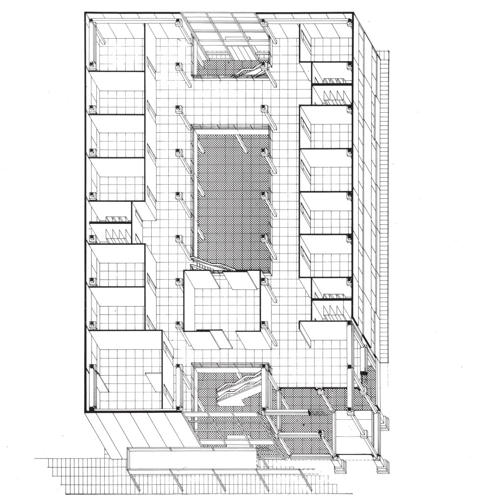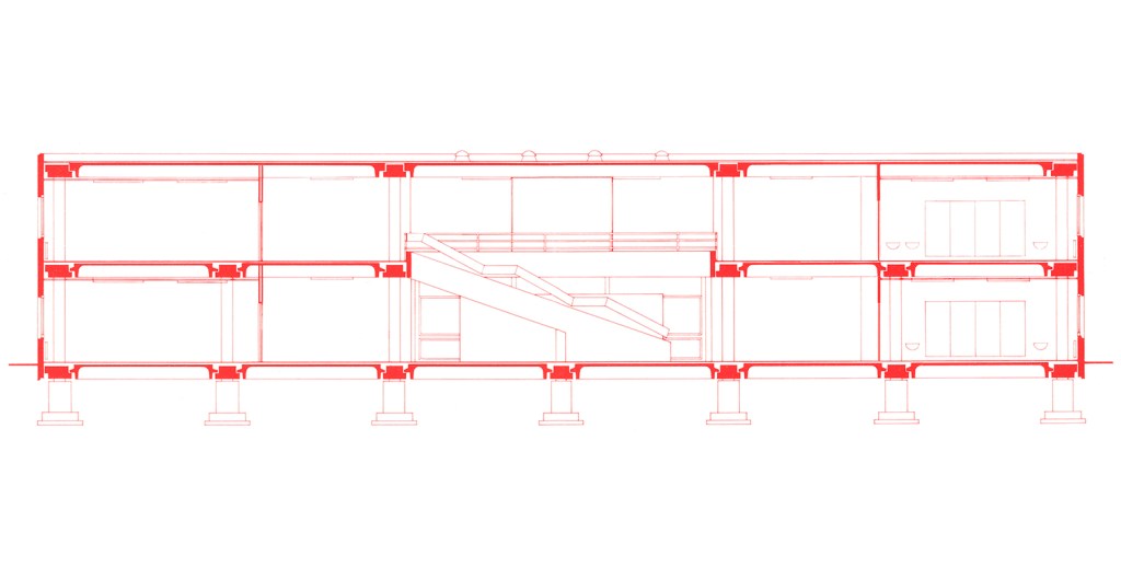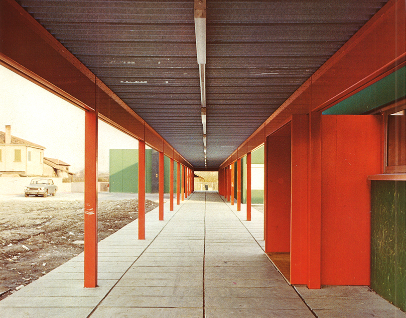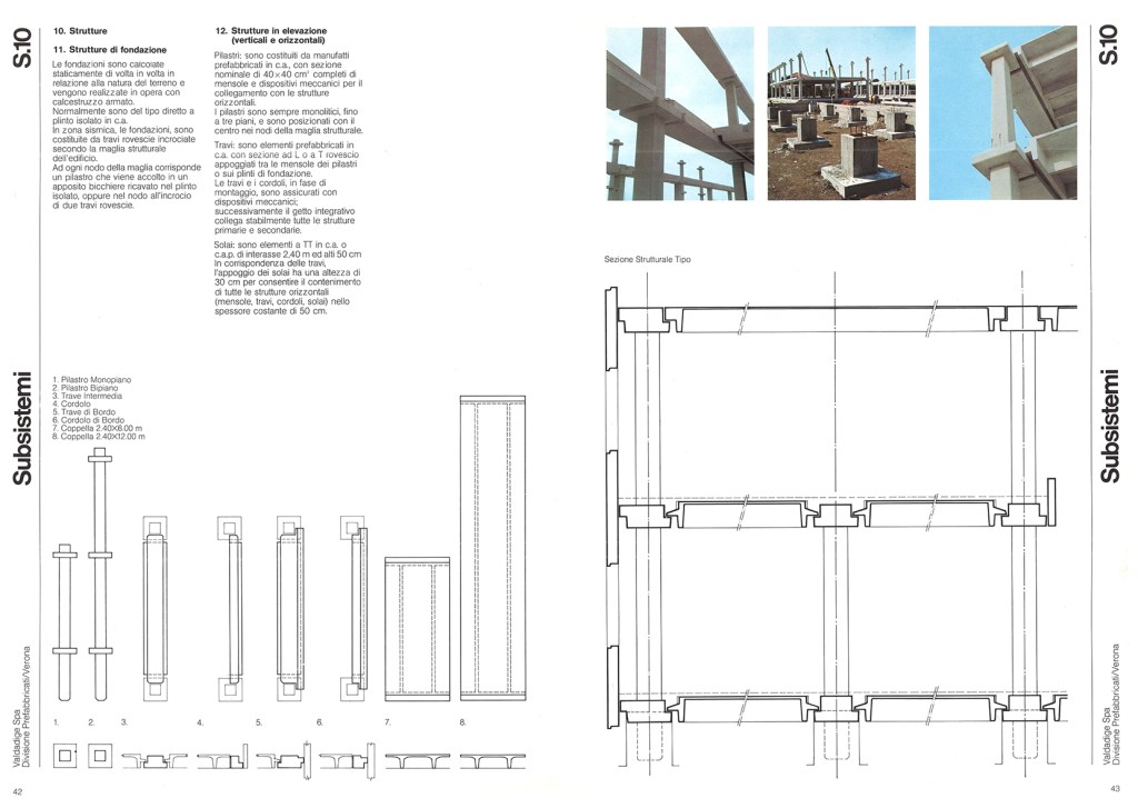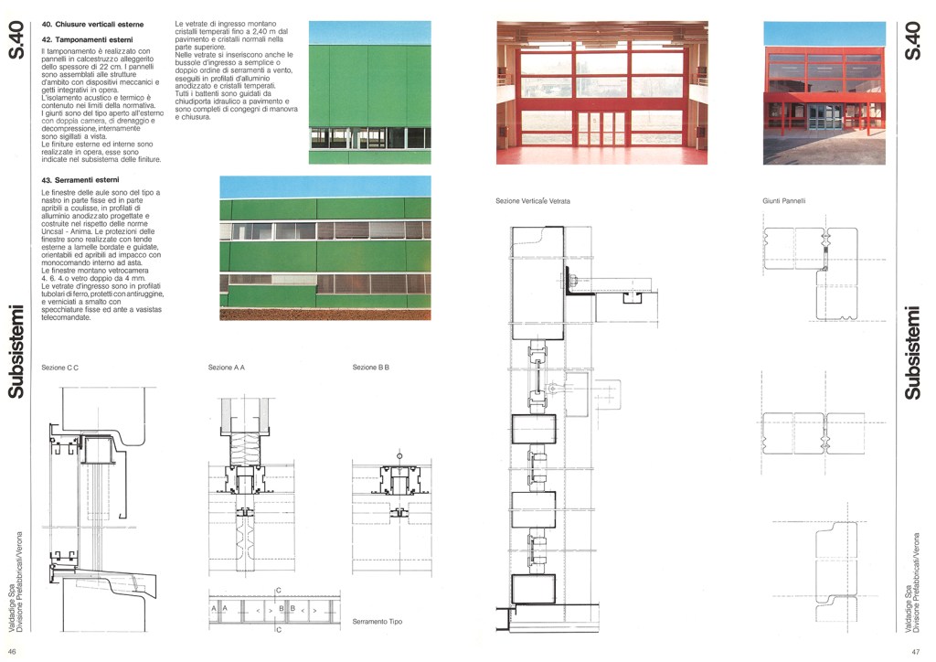 Sistema industrializzato per la realizzazione di edifici scolastici per scuole medie ed elementari. La soluzione proposta prevede tre unità lineari (spazi didattici, palestra e mensa) liberamente componibili lungo un asse di circolazione. La relazione con il contesto, nelle diverse situazioni trattate, è facilitata dal fatto che diverse parti organizzano già un ambito definito, per cui la scuola diventa un piccolo nucleo urbano piuttosto che un grande edificio.