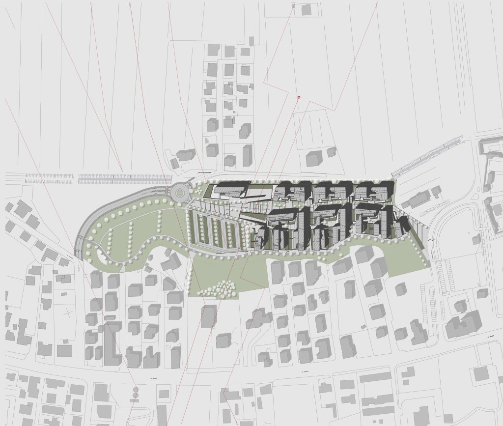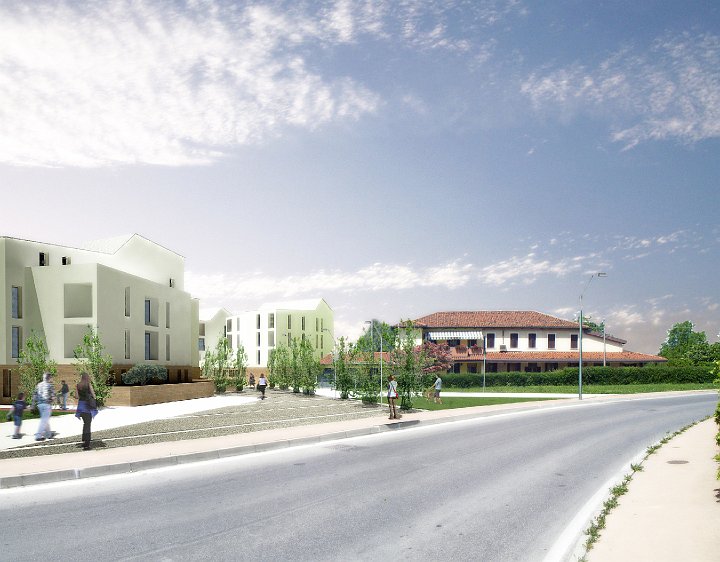 Il nuovo insediamento di 200 alloggi vicino al centro di Chirignago, è caratterizzato da un sistema di spazi pubblici completamente pedonalizzato, l’accesso carrabile ai lotti infatti avviene attraverso il livello dell’interrato.