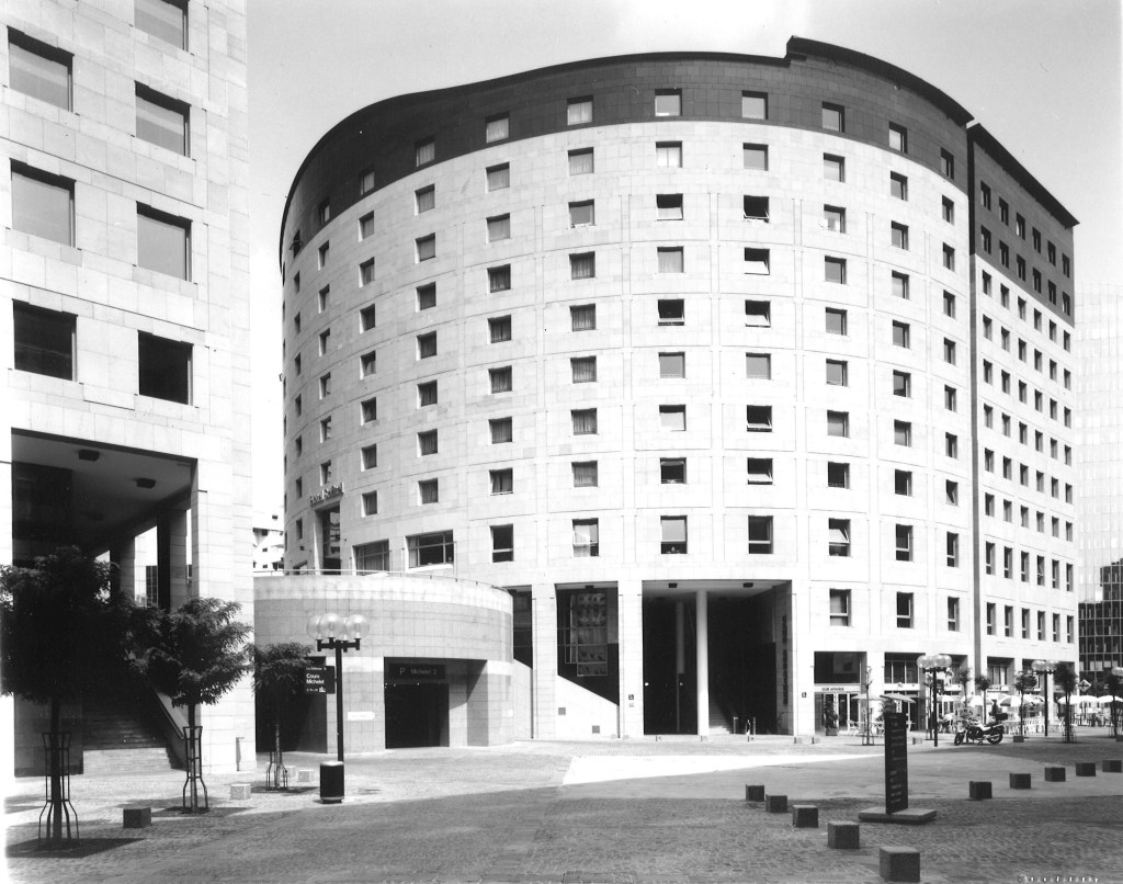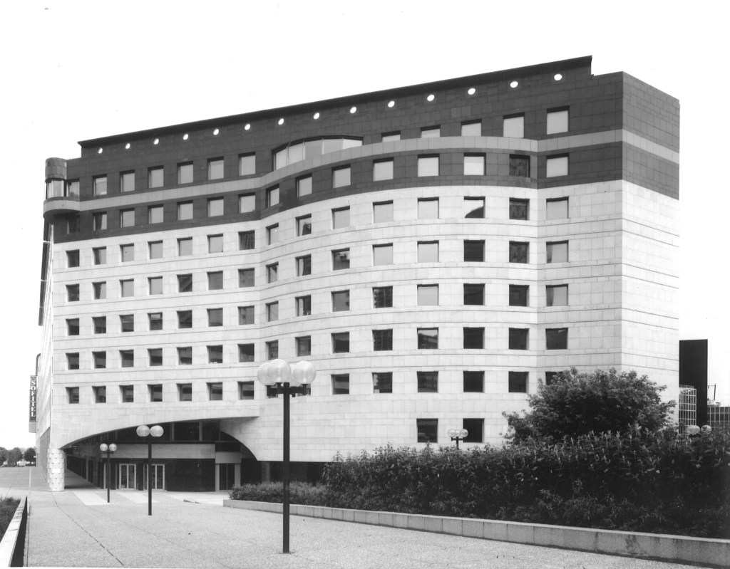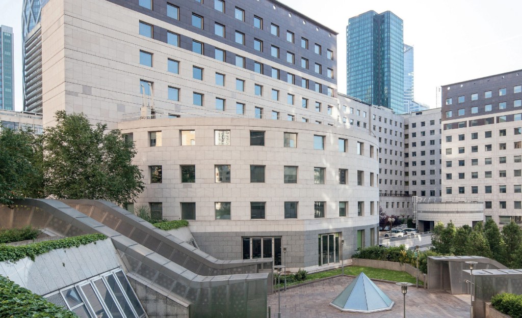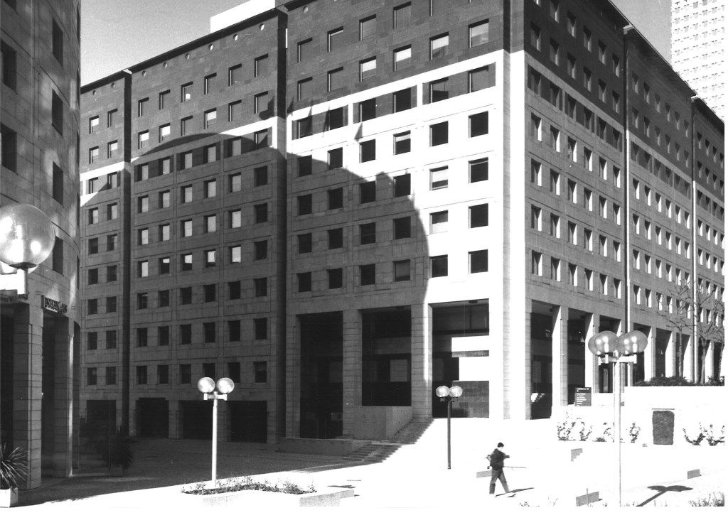Il complesso di uffici è situato nella parte bassa dell’Esplanade che forma l’asse centrale de La Défense. Scendendo l’Esplanade in direzione Parigi, si scopre da lontano la testata dell’IBM piegata a 45 gradi con la grande apertura dei due archi incrociati. Il complesso delimita il fronte sud di un corso alberato che costituisce l’unico vero “spazio urbano” del quartiere. Già da lontano si percepisce la suddivisione del complesso in più “case” il cui ritmo evoca quello di un “boulevard” parigino, mentre la massa muraria viene caratterizzata dai due colori della pietra, con il coronamento in porfido levigato che rispecchia il cielo. Le grandi aperture ad arco nella testata dell’IBM e nella testata opposta verso parigi segnano chiaramente gli ingressi principali. Entrati nella hall si scopre un ampio spazio organizzato su tre livelli connessi visivamente.