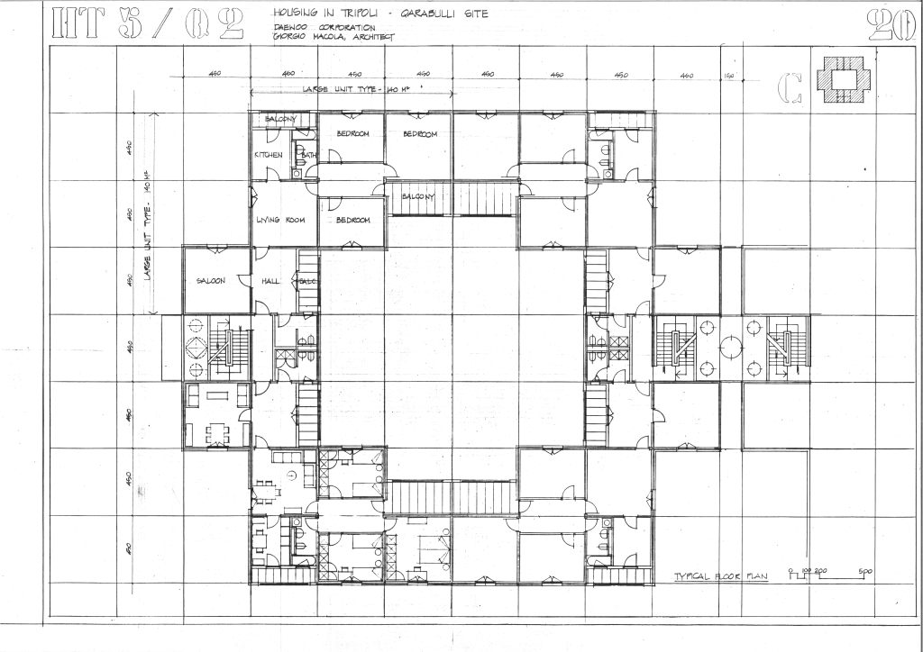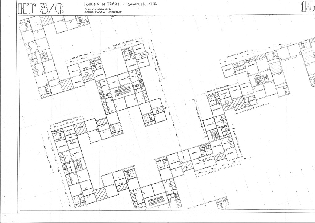 Studio per un sistema industrializzato per realizzare 5.000 alloggi nella regione di Tripoli e 7.000 nella regione di Bengasi. Il sistema prevedeva la realizzazione di impianti di produzione di componenti prefabbricati pesanti sul posto. In applicazione dello studio è stato progettato un intervento campione per 500 alloggi a Quaraboulli vicino a Tripoli con urbanizzazioni, viabilità e parcheggi, servizi pubblici, commerciali e religiosi, spazi collettivi e di vicinato e sistemazioni a verde. L’intervento è stato realizzato successivamente dai partner coreani solo per la parte residenziale ed in maniera difforme rispetto al progetto originario.