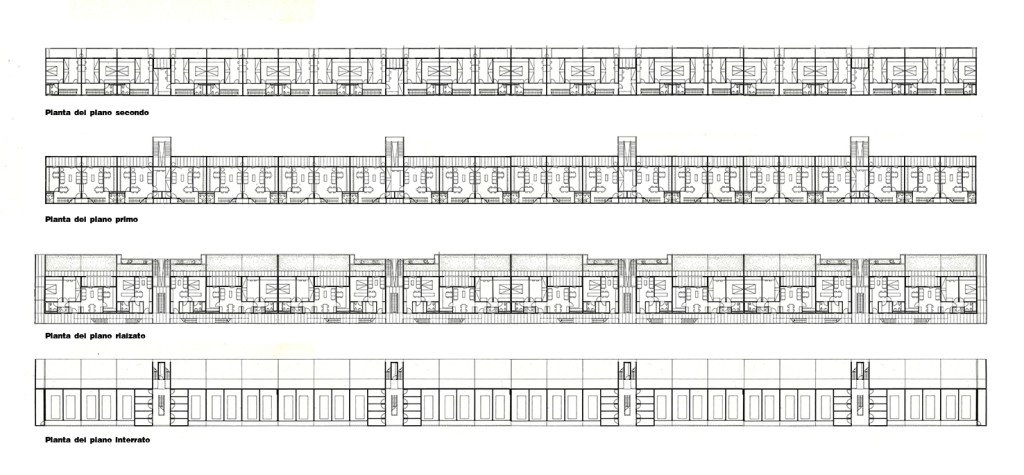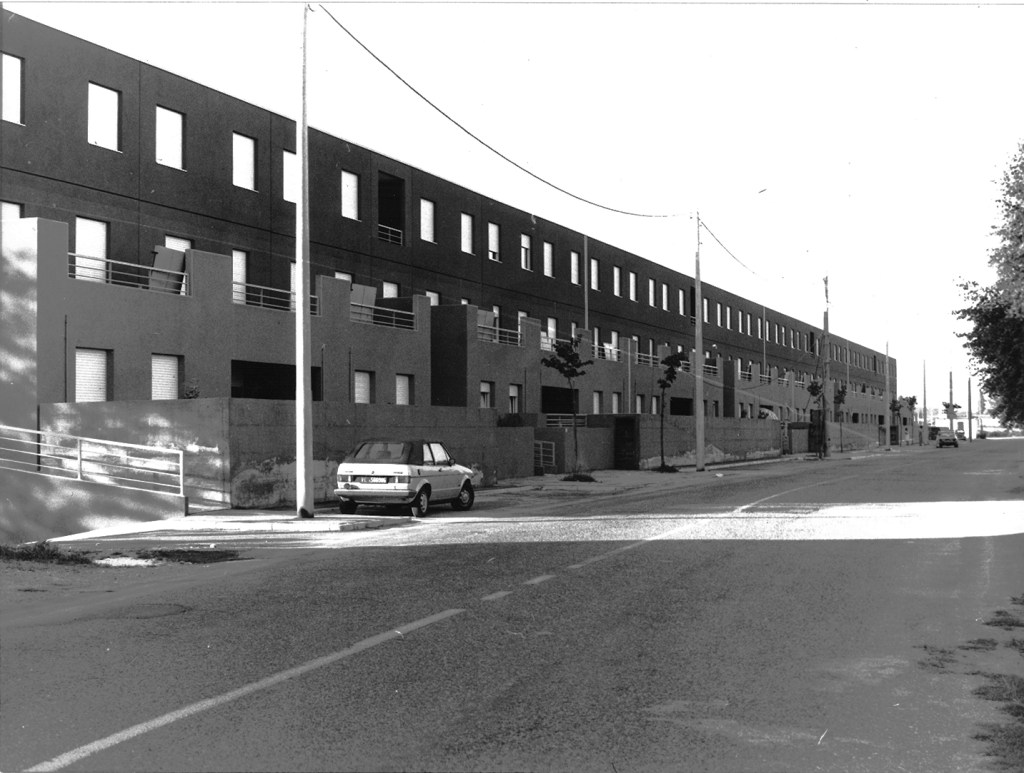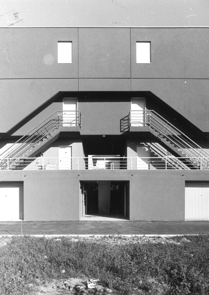 Edificio per alloggi di tipo economico, progettato come elemento di definizione del limite tra una zona di espansione, poco strutturata e quasi completamente costituita da singole case, e la campagna, comprende 40 alloggi su tre piani (più un piano di garage) di cui 16 simplex al piano terra con giardino privato e 24 duplex al primo e secondo piano, accessibili direttamente con scala privata da un ballatoio a piano terra. Interamente realizzato in elementi prefabbricati, questo manufatto appartiene a una serie di studi e sperimentazioni dei primi anni ’80 nel campo della prefabbricazione.