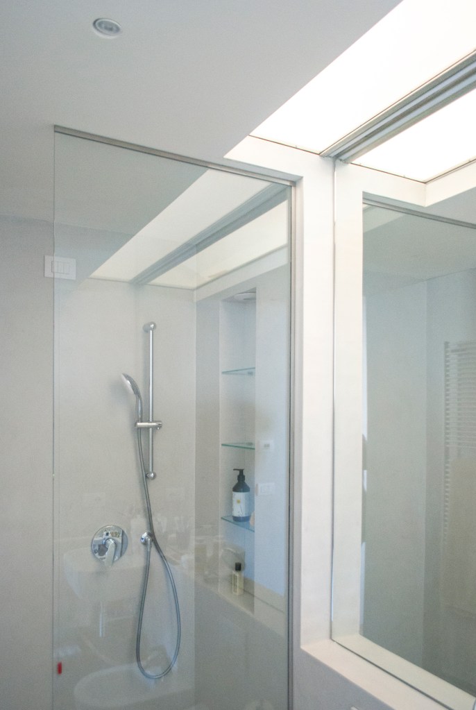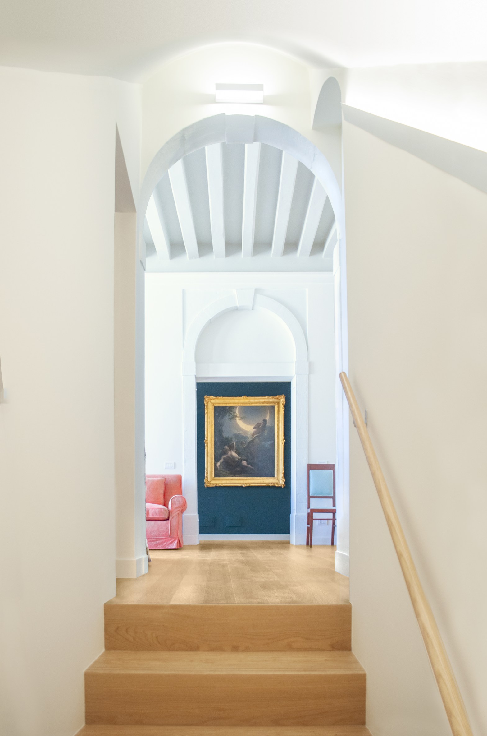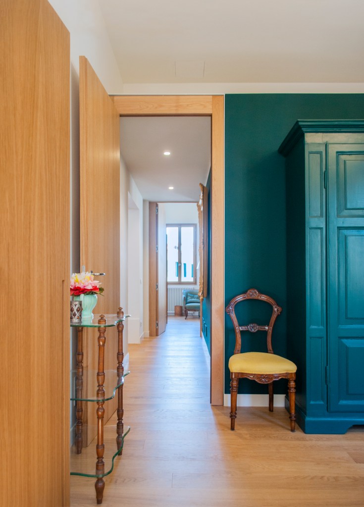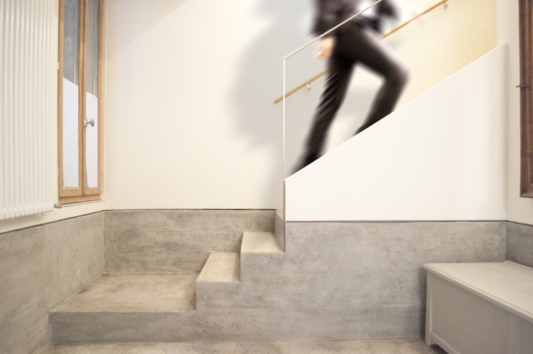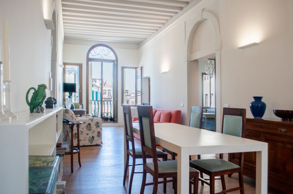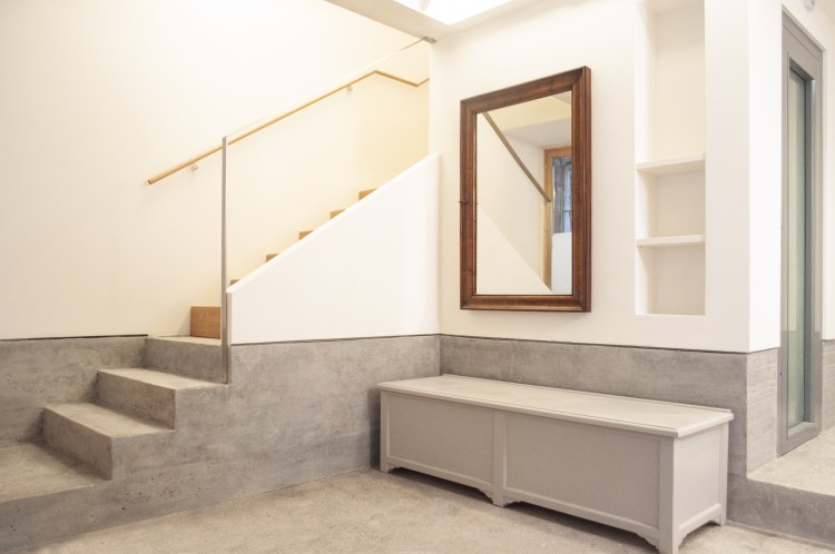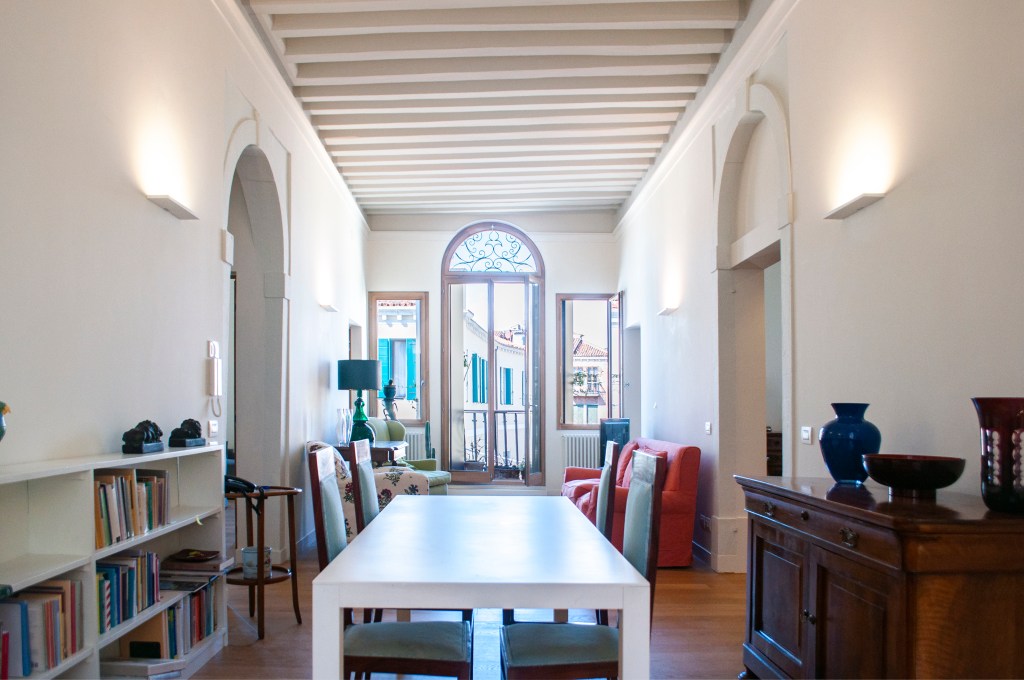 La nuova suddivisione in unità del palazzetto veneziano offre l’occasione di riordinare le funzioni e gli spazi di collegamento interni alla casa. Viene confermata la conformazione tipologica del lotto gotico veneziano con il soggiorno passante a tutti i livelli; nelle ali laterali dei volumi minori contenenti bagno, scale, cucina scandiscono lo spazio passante tra le camere. Al piano terra un basamento di calcestruzzo levigato, in contrasto con il legno di rovere delle pavimentazioni e della scala, segna con quote variabili di piani il livello dell’alta marea.