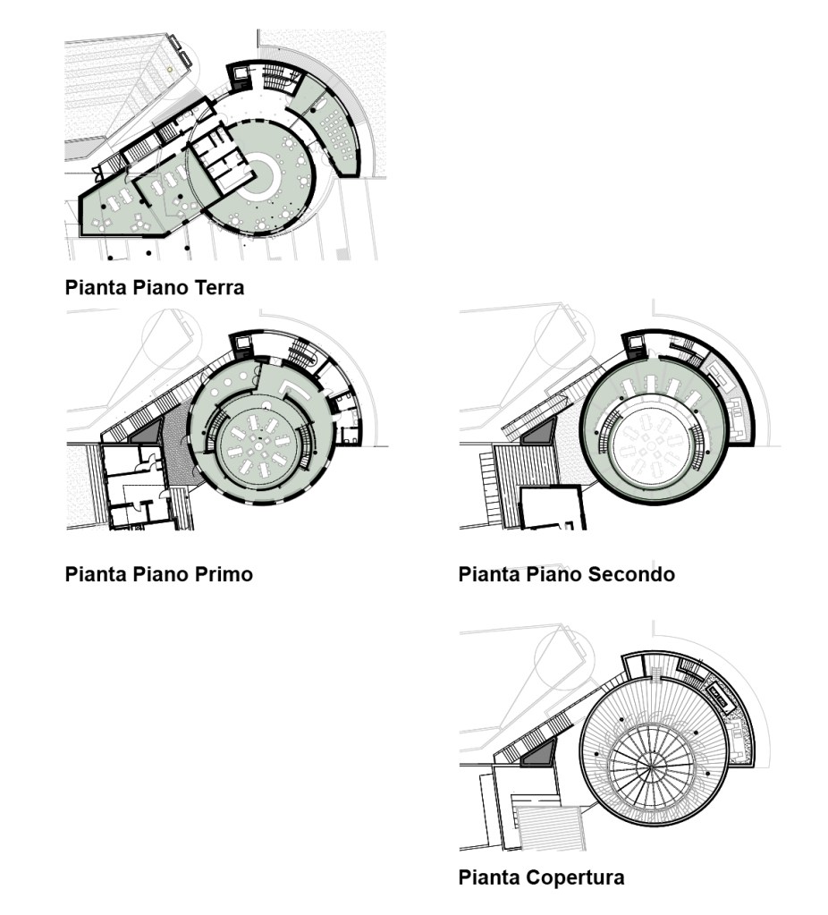 riconoscibilità del nuovo quartiere, e dall’altra facendo riferimento a esperienze storiche (Biblioteca di Asplund) e più recenti (Biblioteca di J.N. Baldeweg) di utilizzazione dello spazio circolare per organizzare le sale di lettura di una biblioteca.