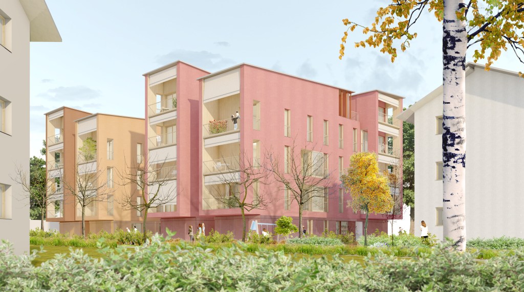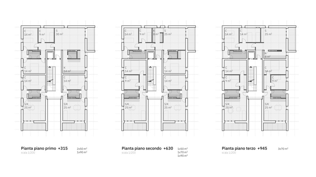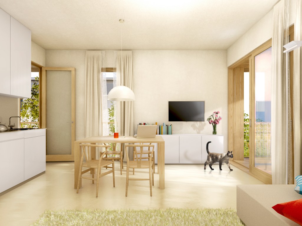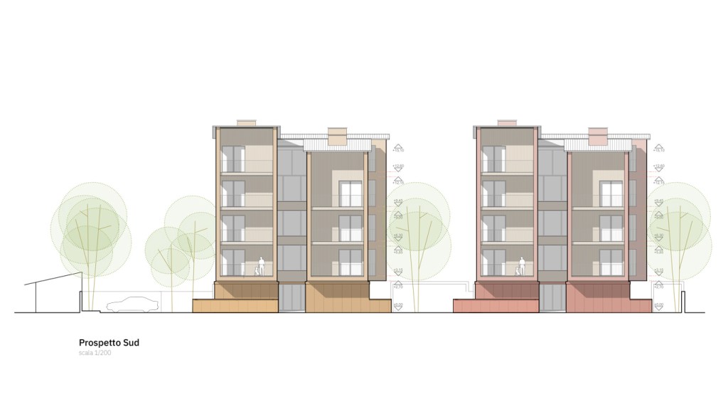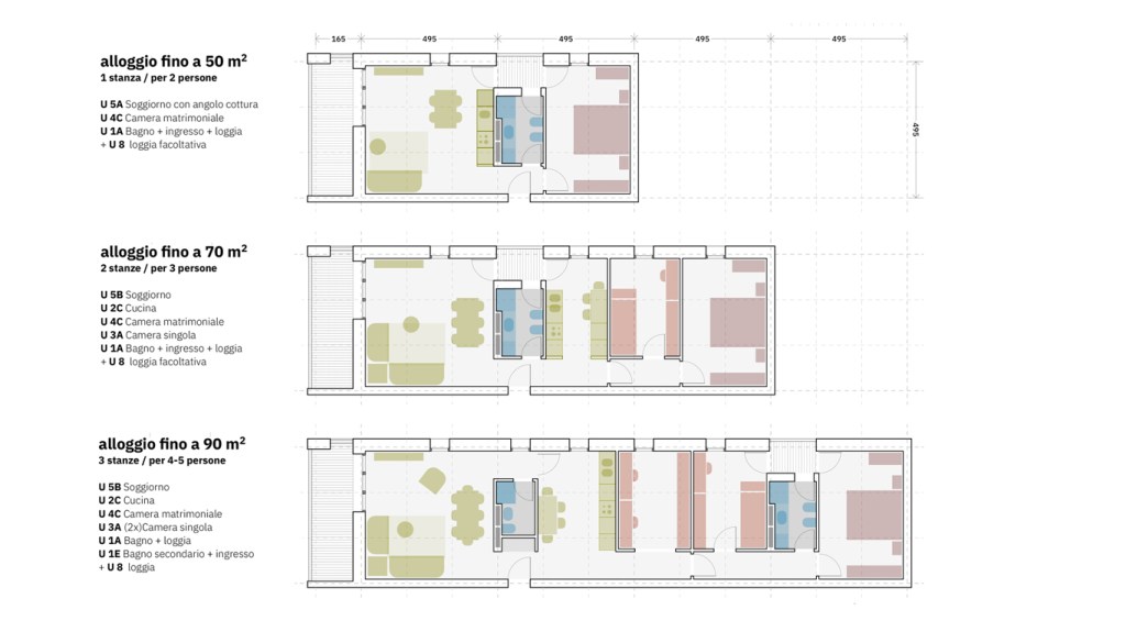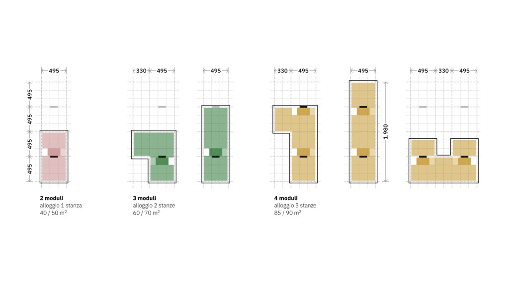 L’uso di un sistema consente di ottenere questo risultato e garantisce il raggiungimento di elevati livelli di flessibilità attraverso componenti tipologici standardizzati (bagni, cucine, stanze, soggiorni) e elementi costruttivi modulari, in questo caso in legno lamellare o tipo x-lam.