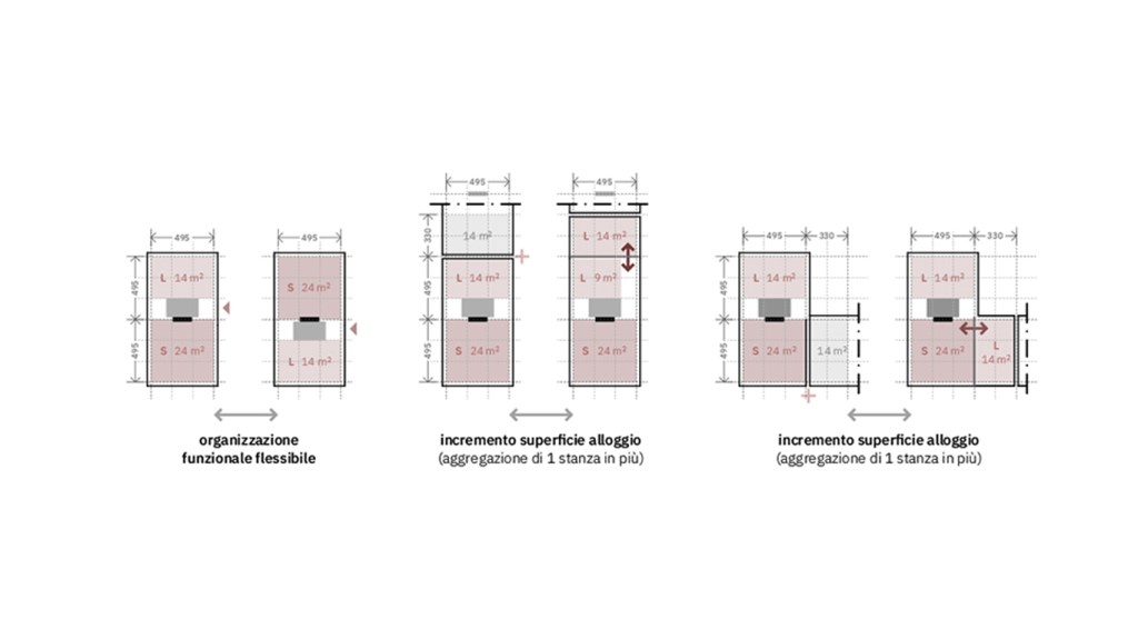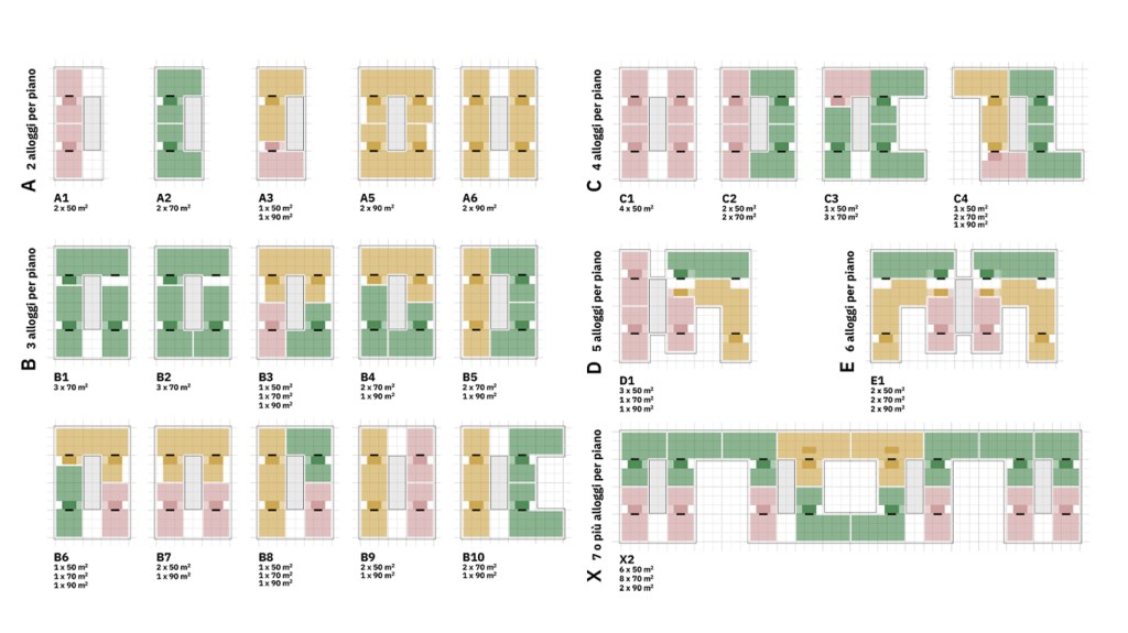 La flessibilità del sistema consente di rispondere ai diversi contesti in cui i nuovi edifici si inseriscono ed in particolare di adeguare i programmi funzionali (numero e tipologia degli alloggi) e la configurazione volumetrica (4/5 piani – compatibilità con il contesto) ai diversi siti in cui sarà necessario intervenire contribuendo non solo ad elevare la qualità architettonica degli edifici, ma anche favorendo processi di rigenerazione di interi comparti urbani.