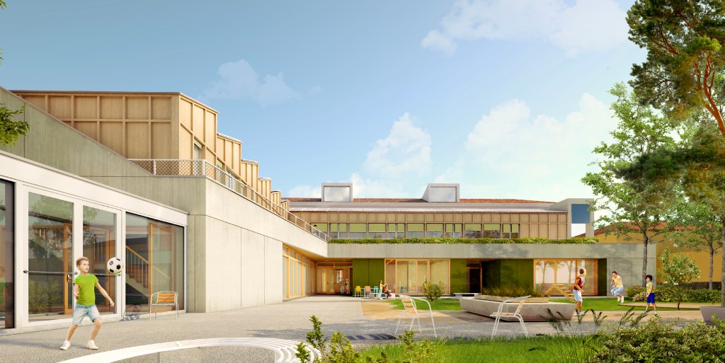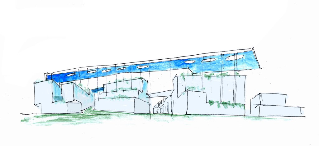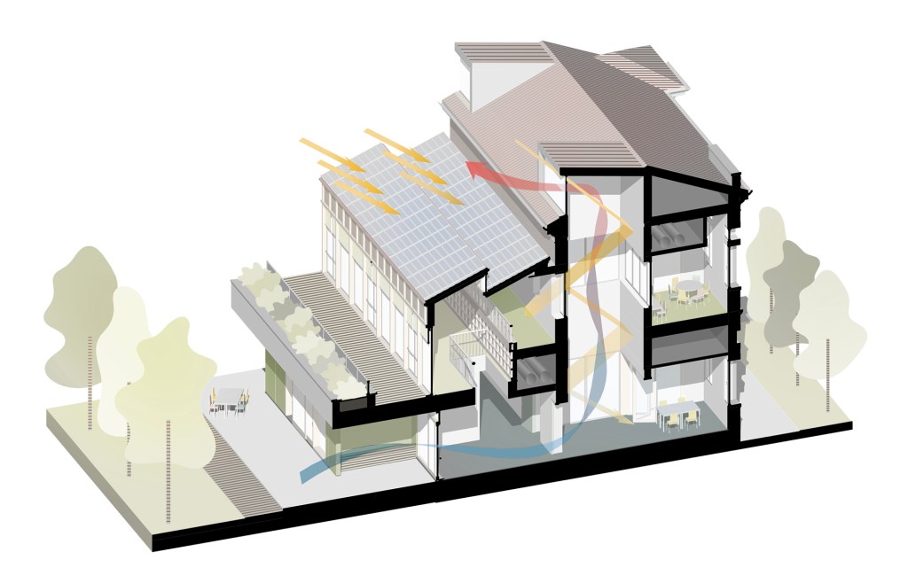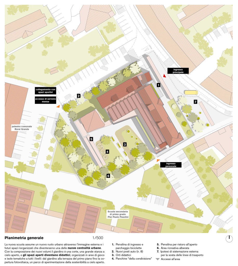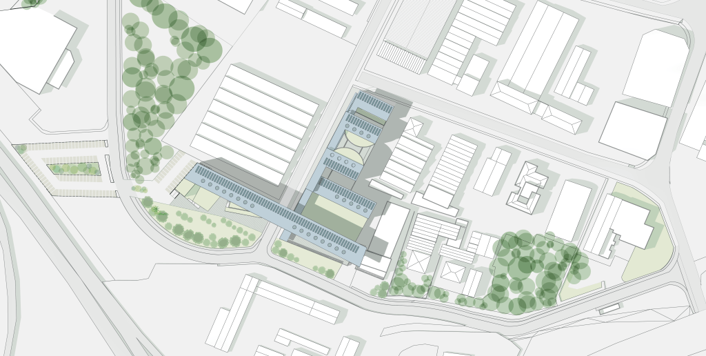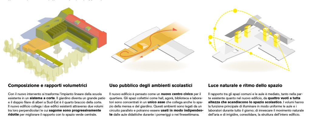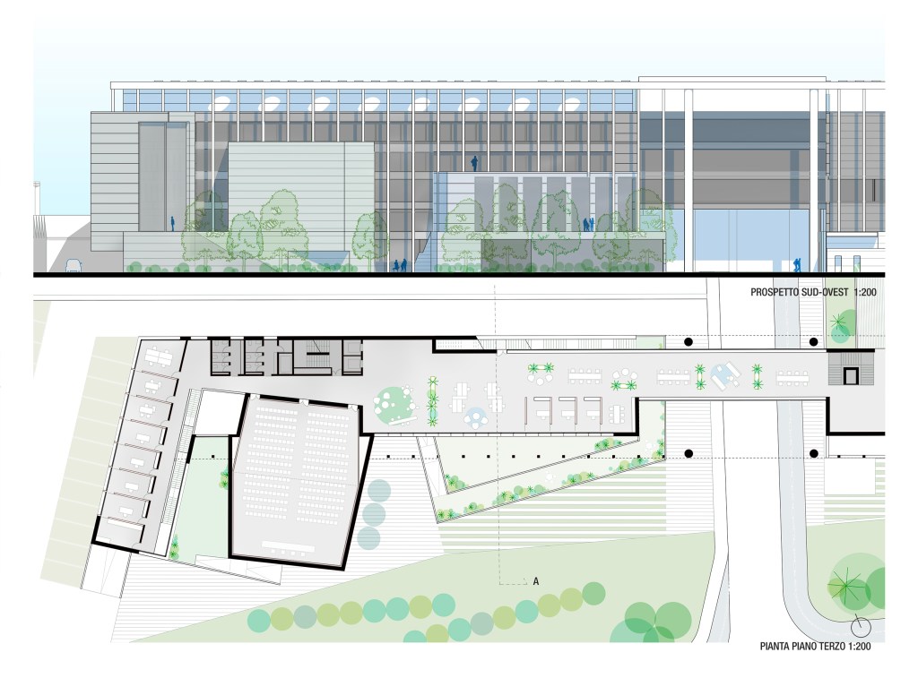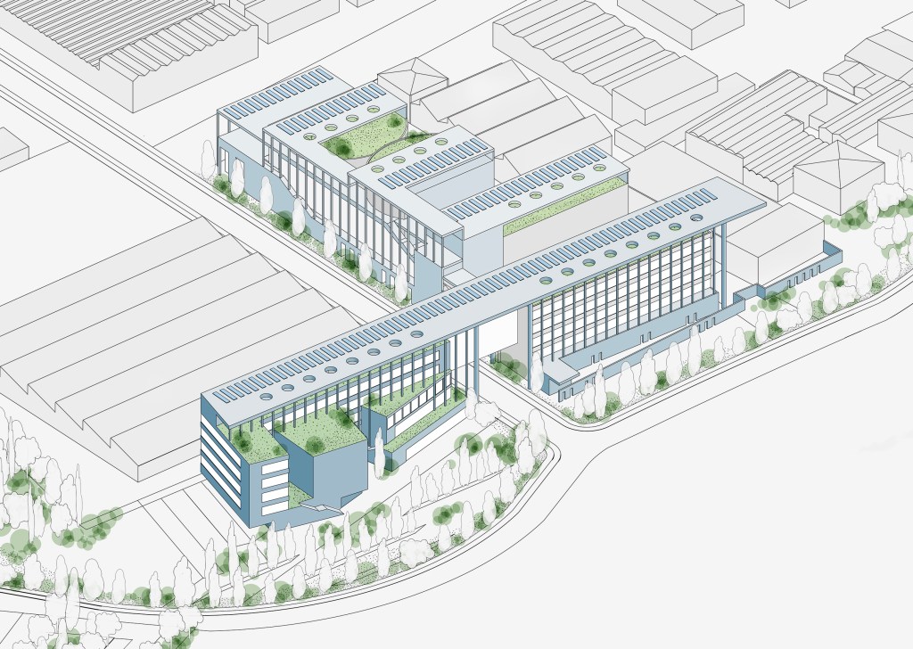 Il nuovo edificio è composto principalmente da un sistema di grandi pensiline fotovoltaiche che “avvolgono” anche l‘edificio esistente su via Magnanelli modificandone l’immagine senza intervenire sulle facciate esistenti.
